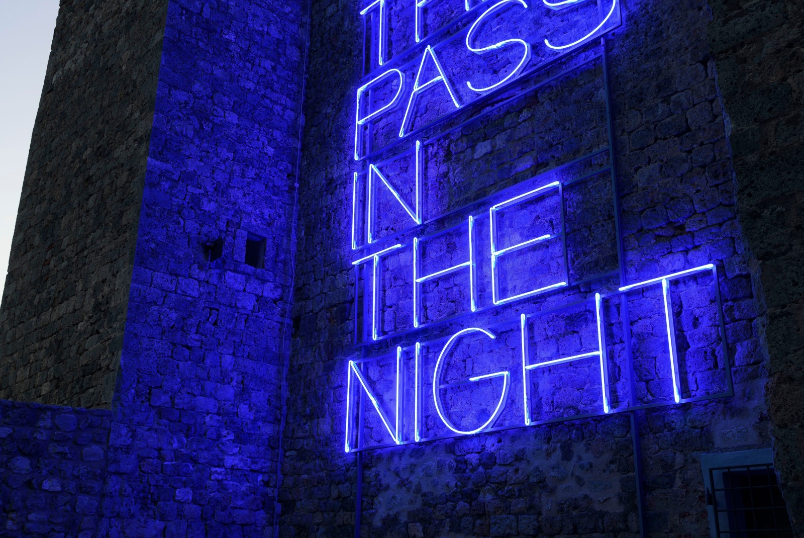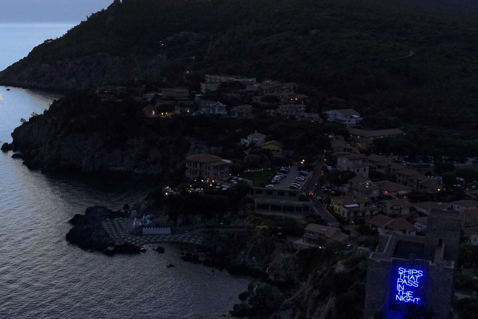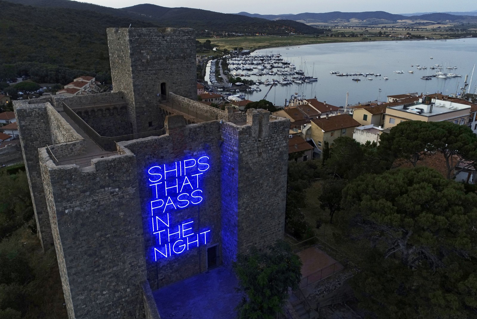 Inaugurato il 4 giugno, il lettering in neon blu SHIPS THAT PASS THE NIGHT di Maurizio Nannucci accende il litorale di Talamone dall’alto della Rocca Aldobrandesca; un’iniziativa che Hypermaremma – manifestazione culturale ormai giunta alla sua quarta edizione – ha fortemente voluto e realizzato nell’ambito di una serie di iniziative artistico-culturali tese a revitalizzare un’area in rapida riscoperta, quella della Maremma. Carlo Pratis, Giorgio Galotti, Matteo D’Aloja gli ideatori di questa iniziativa giocata sul cortocircuito che l’arte contemporanea è in grado di generare portando a contatto l’iperattività di un presente nevrotico con la placida compassatezza dei ritmi di vita della bassa Maremma.
